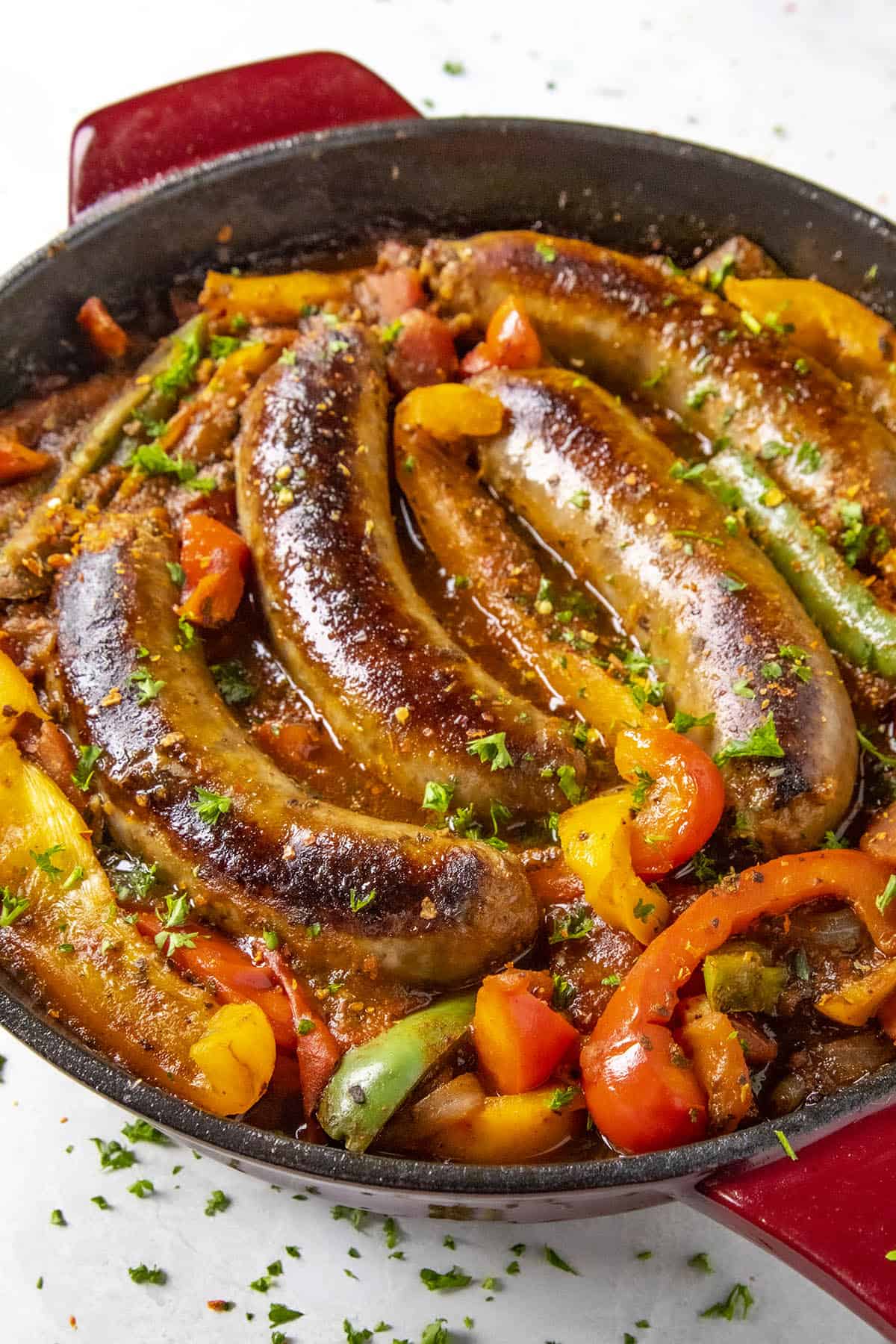 Sausage and a mix of sweet red peppers, green peppers and sautéed onions, of course!